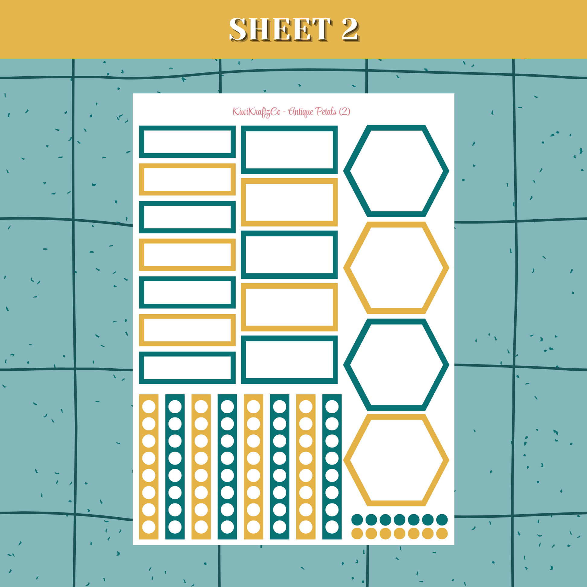 Bring vintage charm to your spreads with Antique Petals. This floral sticker kit features bold retro-style blooms in teal, mustard, and rust tones.