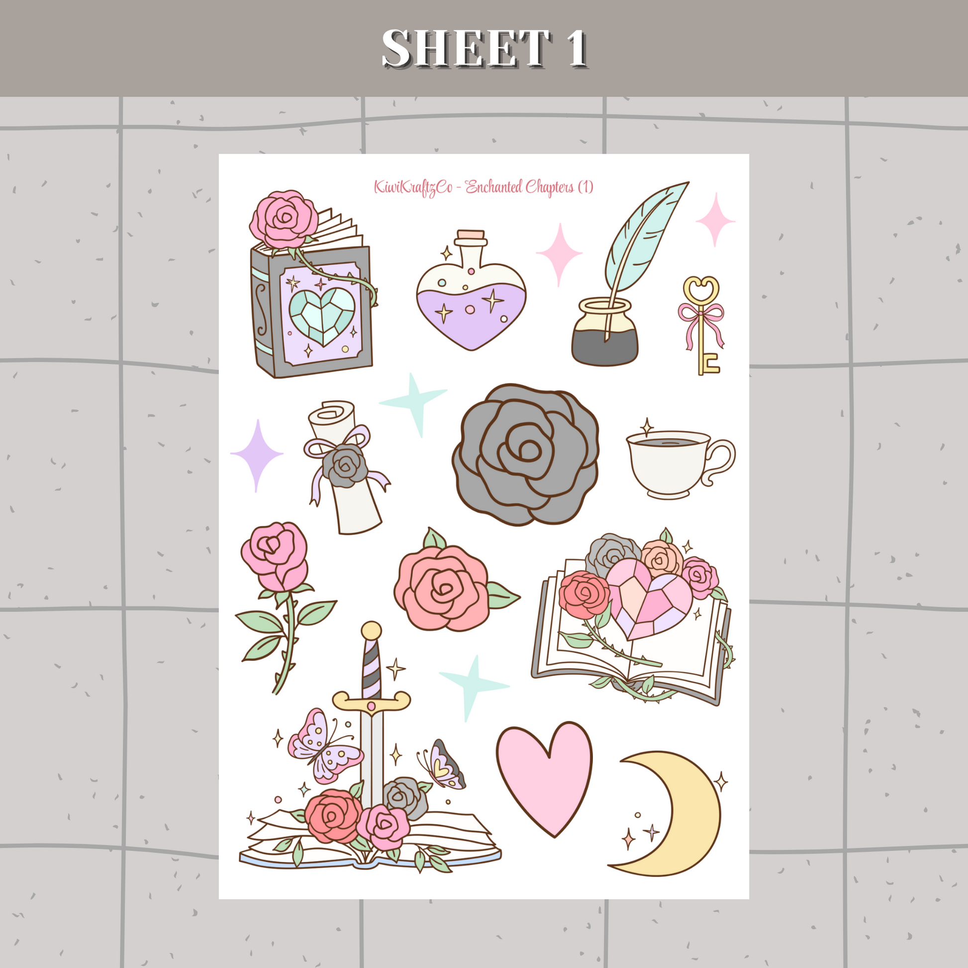 Step into a magical story with Enchanted Chapters. This sticker kit features spellbound books, roses, potions, and dreamy details—perfect for romantic, fantasy, and bookish spreads.
