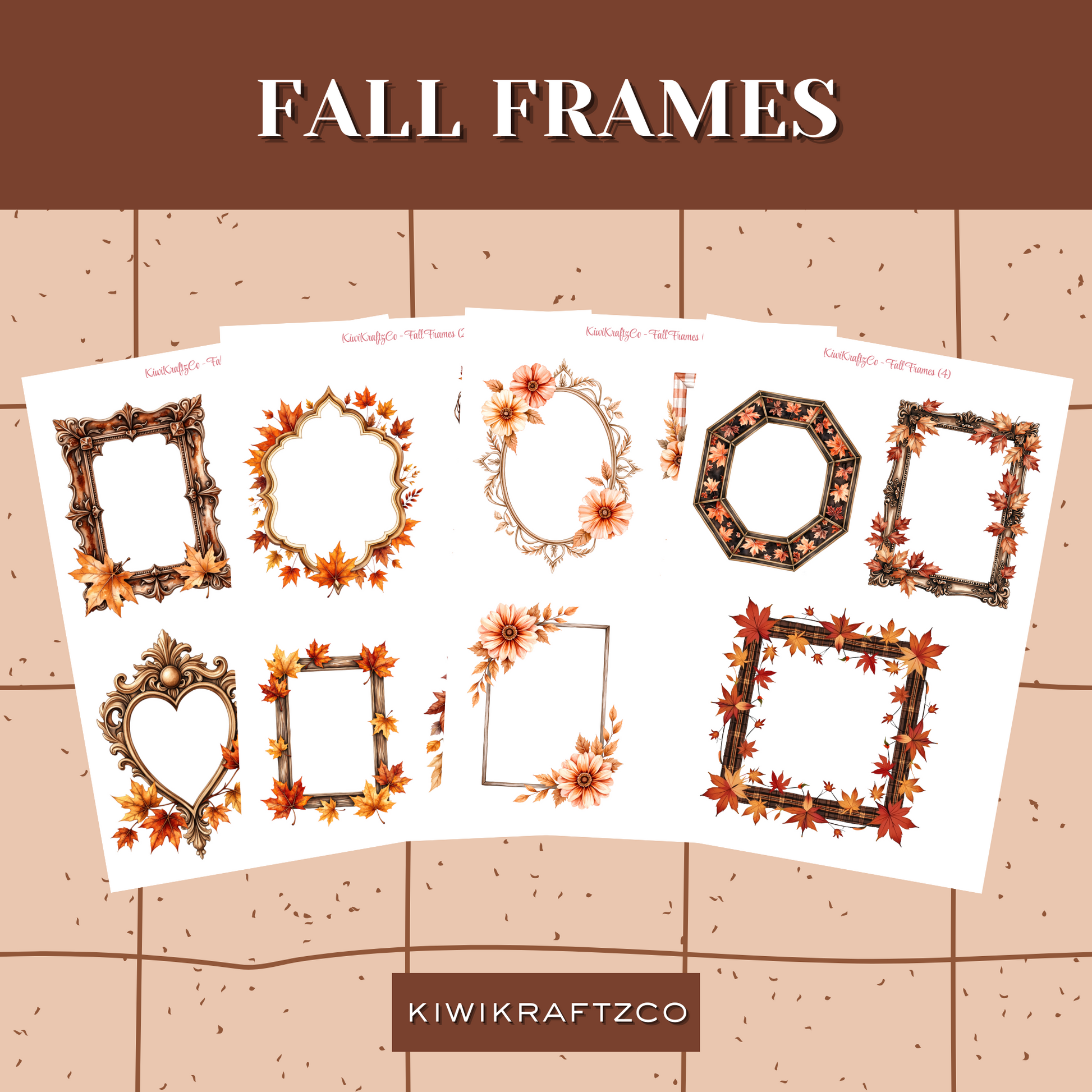 Frame your memories in autumn style with Fall Frames. This sticker kit features a variety of seasonal borders—rustic wood, elegant gold, and floral accents—decorated with warm fall leaves and cozy harvest tones.