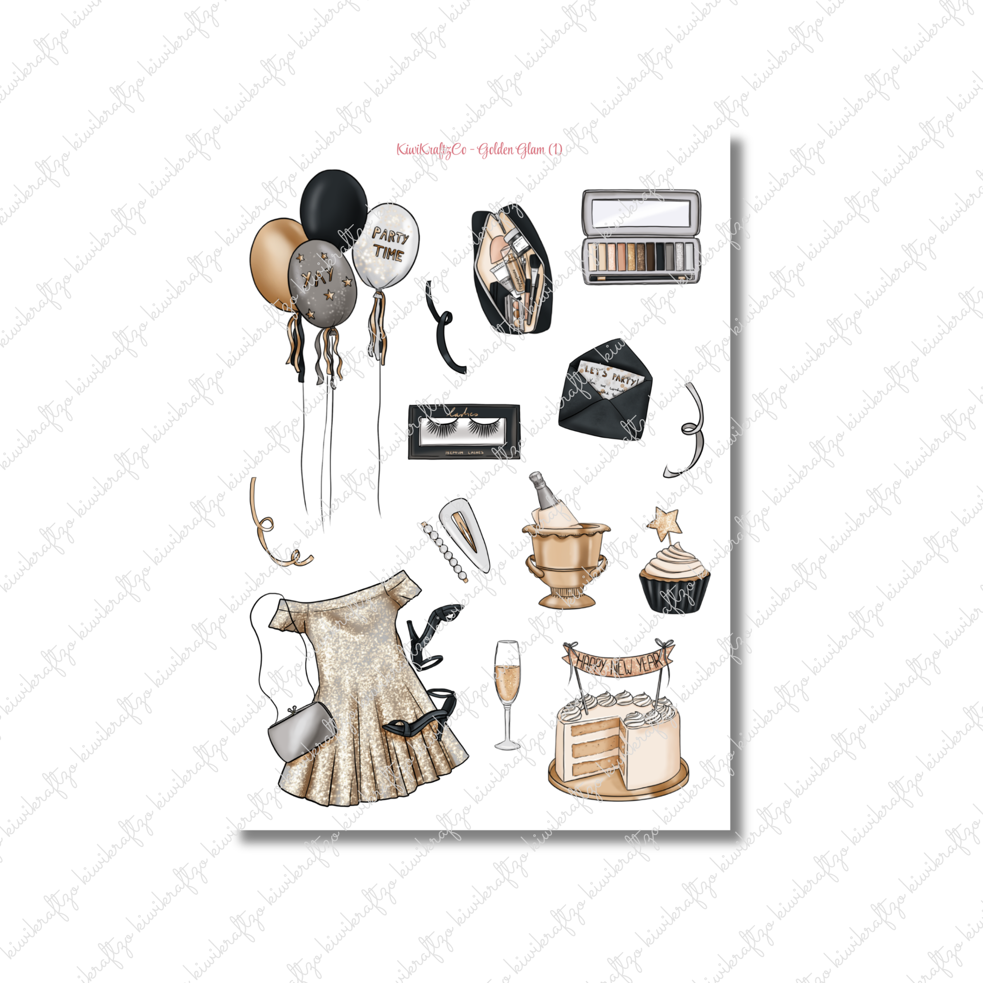 The Golden Glam Kit shines with New Year’s sparkle and sophisticated charm. Featuring gold and black accents, champagne, balloons, and party details—this kit is perfect for celebrating in style and planning a fresh start.